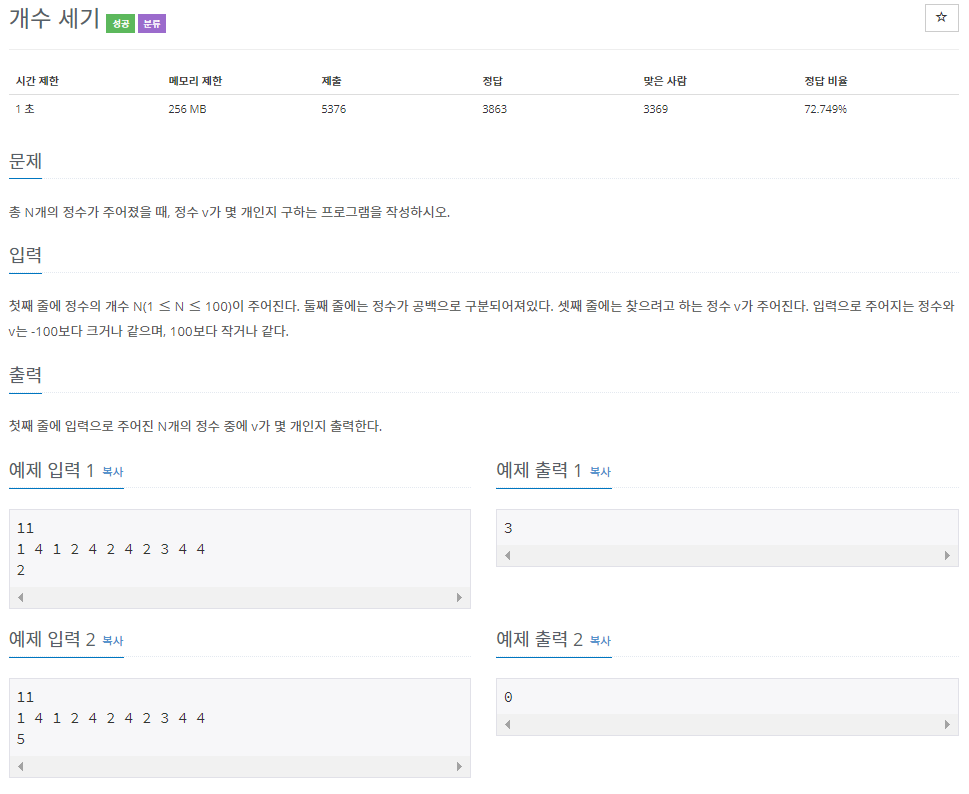 첫째 줄에 정수의 개수 N(1 ≤ N ≤ 100)이 주어진다. 둘째 줄에는 정수가 공백으로 구분되어져있다. 셋째 줄에는 찾으려고 하는 정수 v가 주어진다. 입력으로 주어지는 정수와 v는 -100보다 크거