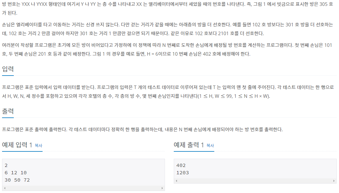 프로그램은 표준 입력에서 입력 데이터를 받는다. 프로그램의 입력은 T 개의 테스트 데이터로 이루어져 있는데 T 는 입력의 맨 첫 줄에 주어진다. 각 테스트 데이터는 한 행으로서 H, W, N, 세 정수