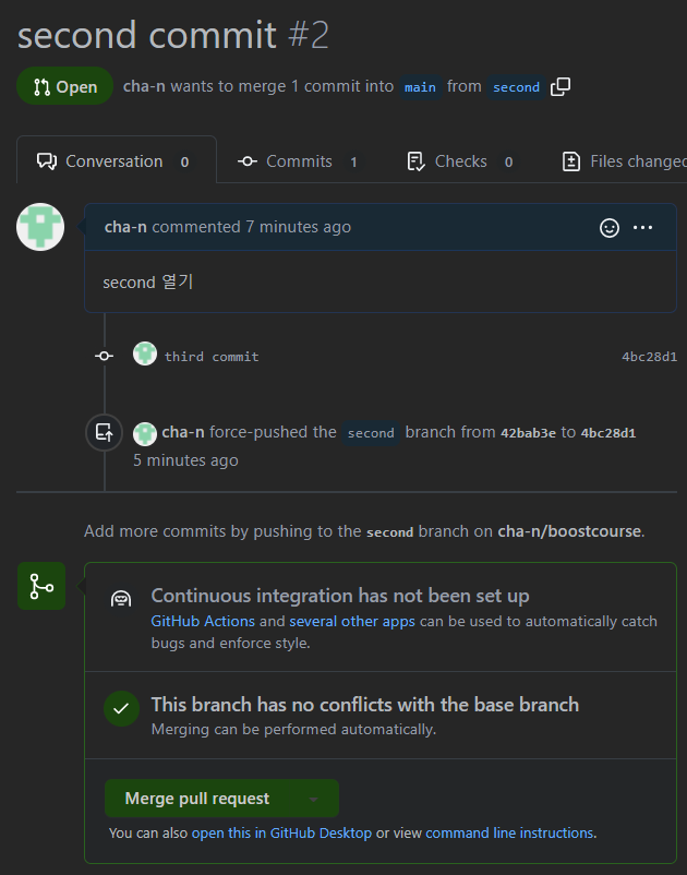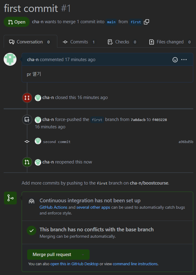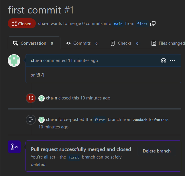 pr 연 상태에서 처음 commit을 reset하면 pr이 닫힌다..
