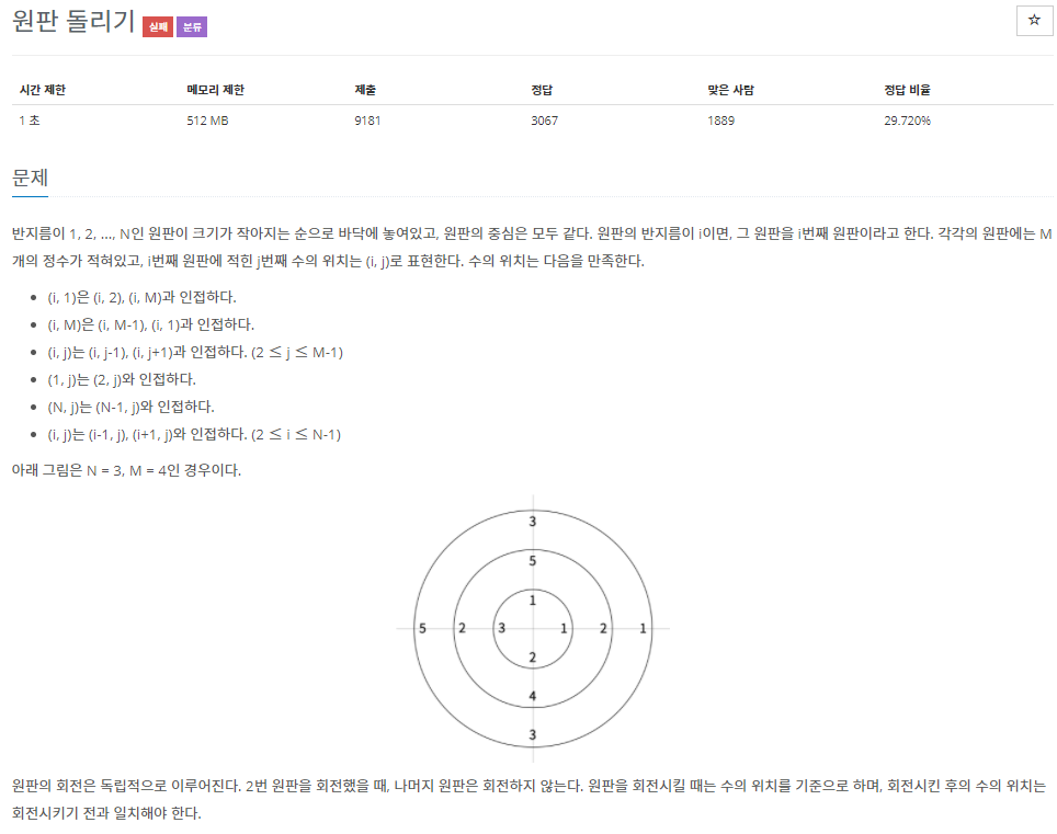 반지름이 1, 2, ..., N인 원판이 크기가 작아지는 순으로 바닥에 놓여있고, 원판의 중심은 모두 같다. 원판의 반지름이 i이면, 그 원판을 i번째 원판이라고 한다. 각각의 원판에는 M개의 정수가 적혀