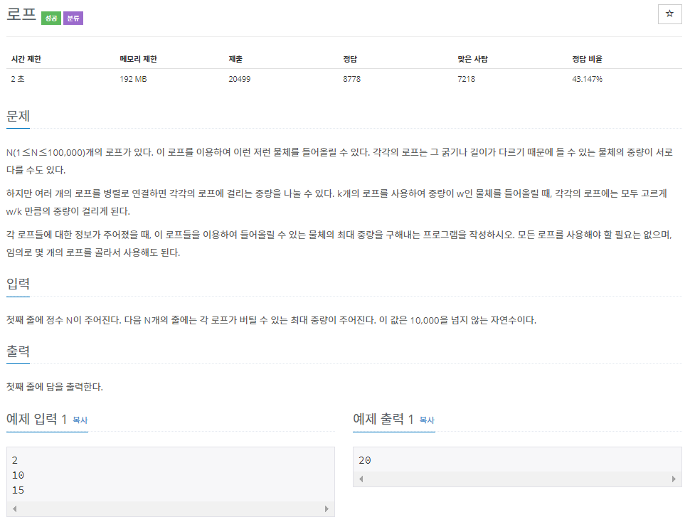 N(1≤N≤100,000)개의 로프가 있다. 이 로프를 이용하여 이런 저런 물체를 들어올릴 수 있다. 각각의 로프는 그 굵기나 길이가 다르기 때문에 들 수 있는 물체의 중량이 서로 다를 수도 있다. 하지만