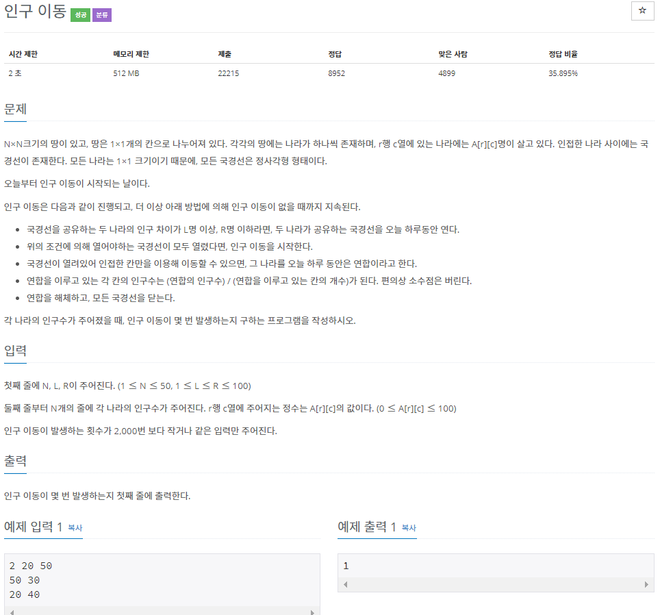 N×N크기의 땅이 있고, 땅은 1×1개의 칸으로 나누어져 있다. 각각의 땅에는 나라가 하나씩 존재하며, r행 c열에 있는 나라에는 A[r][c]명이 살고 있다. 인접한 나라 사이에는 국경선이 존재한다. 모